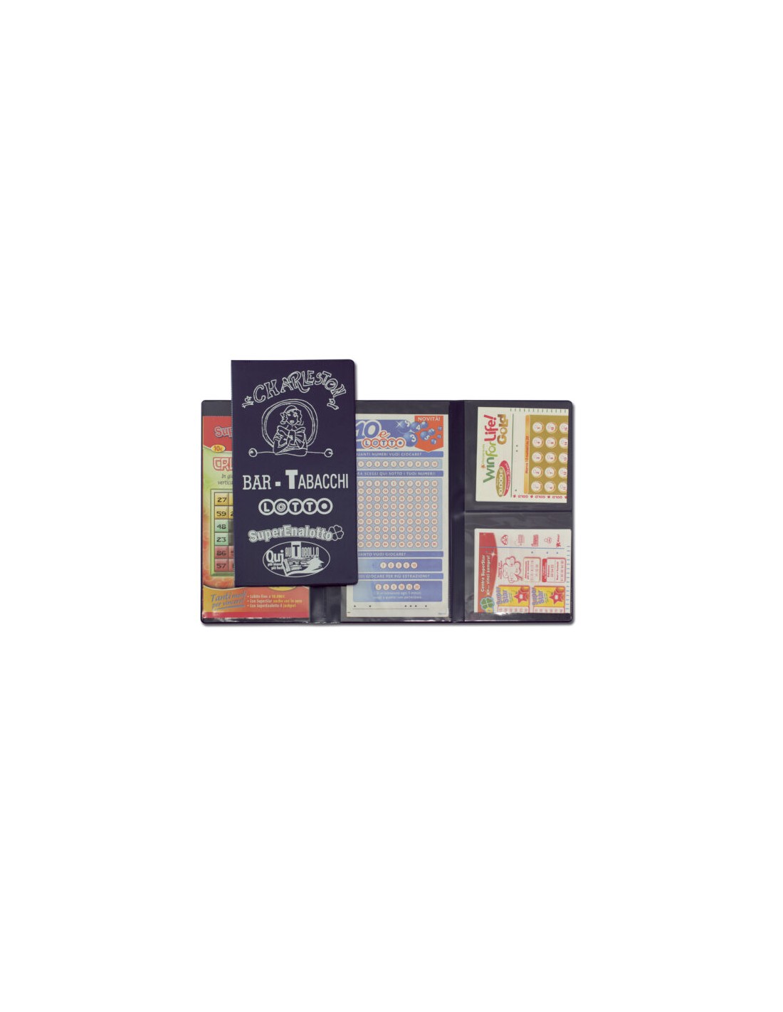 Porta schedine a 3 ante personalizzato, realizzato in finta pelle con internamente 2 tasche intere e 1 divisa in due, tutte trasparenti.