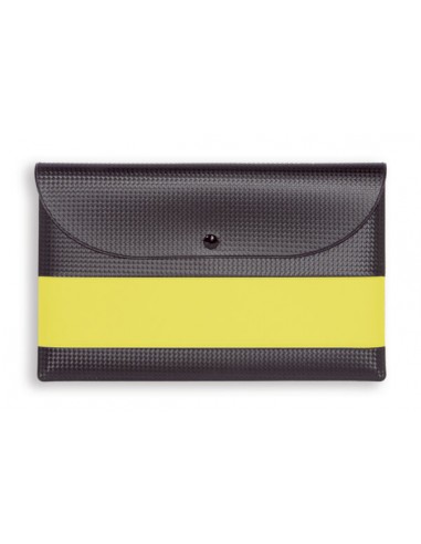 Portadocumenti bicolore maxi personalizzato. Realizzato in gommato carbonio con patta con bottone, fascia accoppiata in gommato tam colorato.