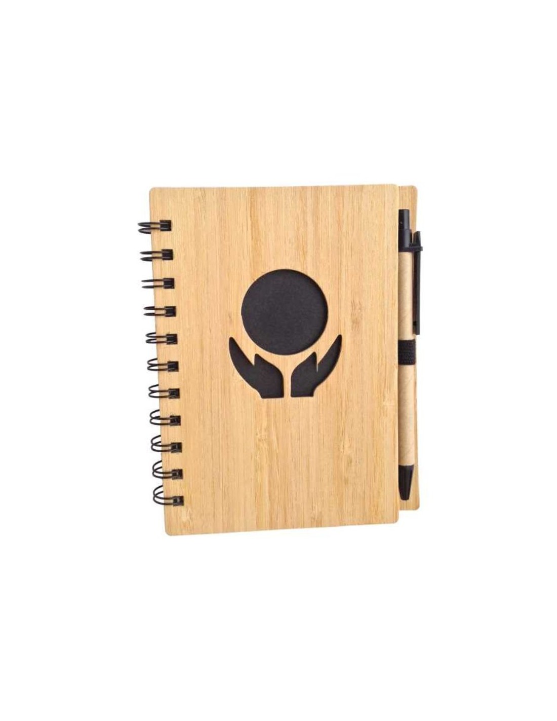 Blocco appunti 70 fogli avorio neutri, copertina in cartone foderato in bamboo, con penna a sfera in cartone riciclato. La copertina si presenta prefustellata con l'immagine del mondo e due mani che lo sostengono.