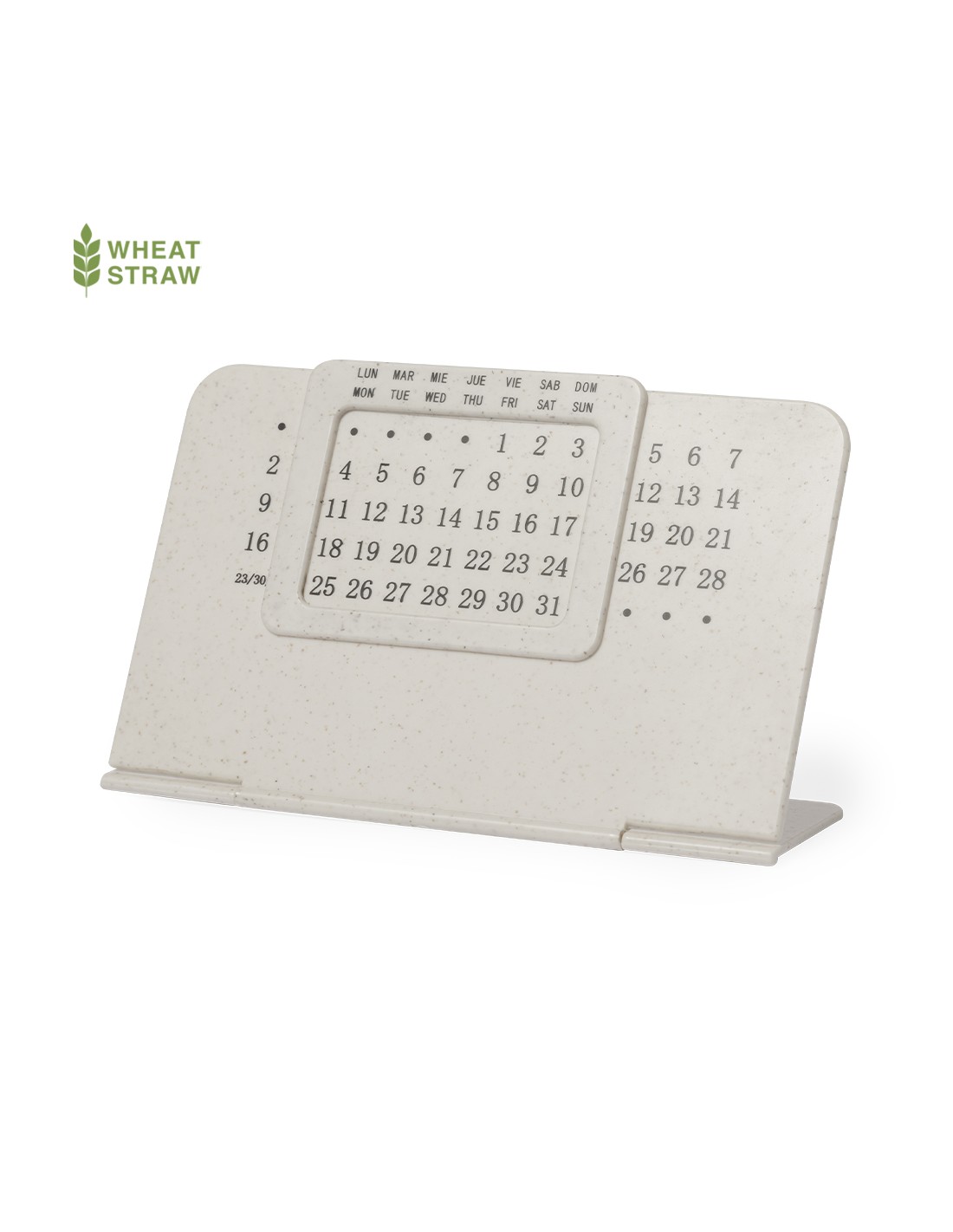 Calendario perpetuo realizzato in fibra di grano personalizzato. Ha un supporto pieghevole.