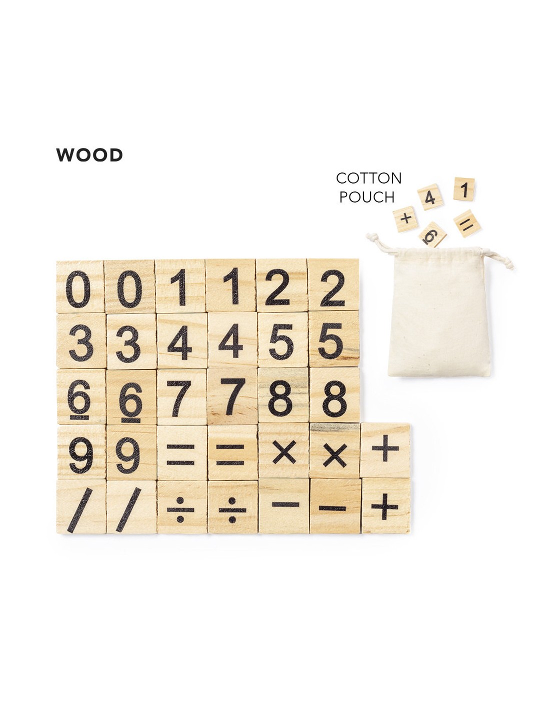 Gioco di calcolo personalizzato in legno di pino naturale. Set da 32 pezzi in una custodia in 100% cotone con coulisse abbinata.