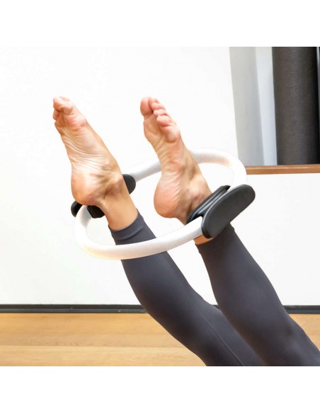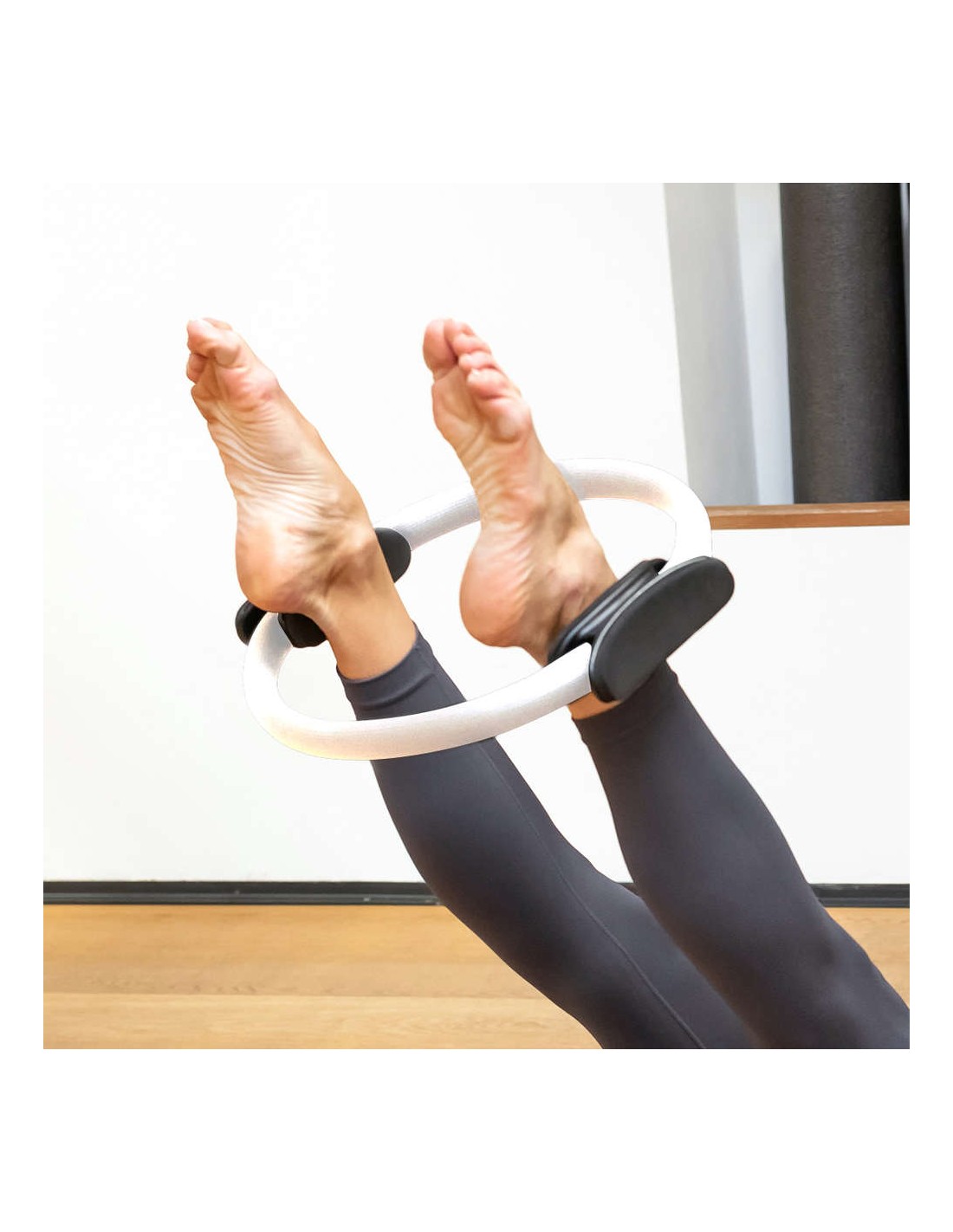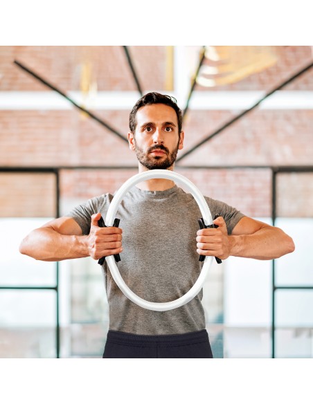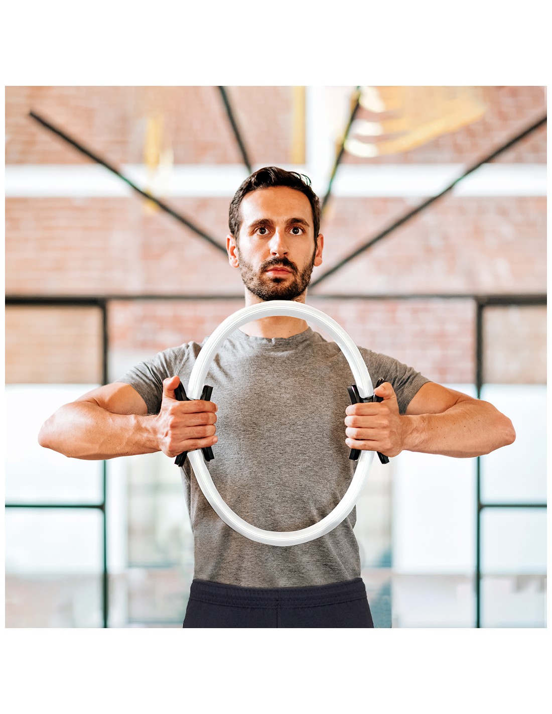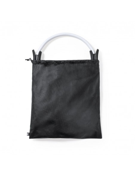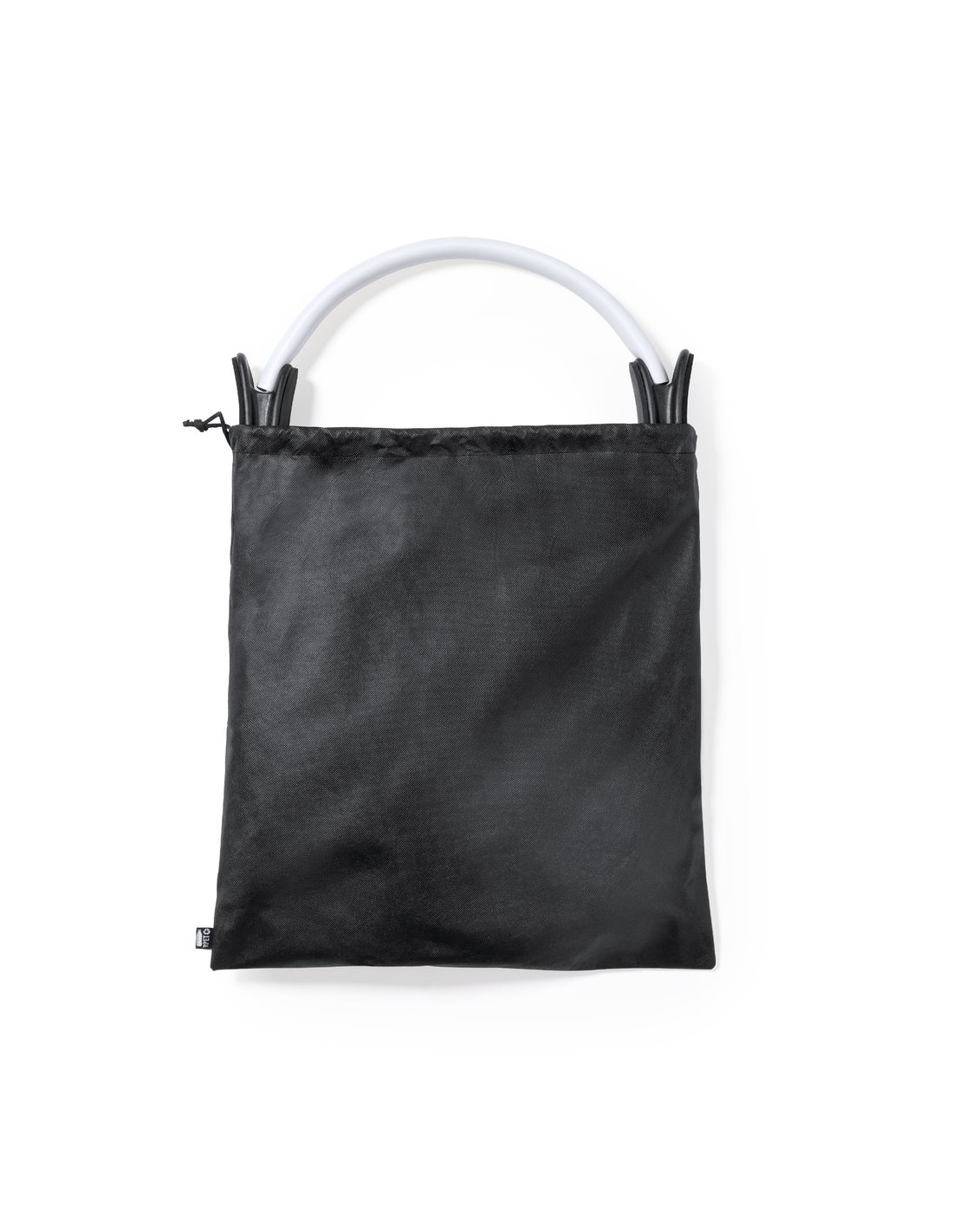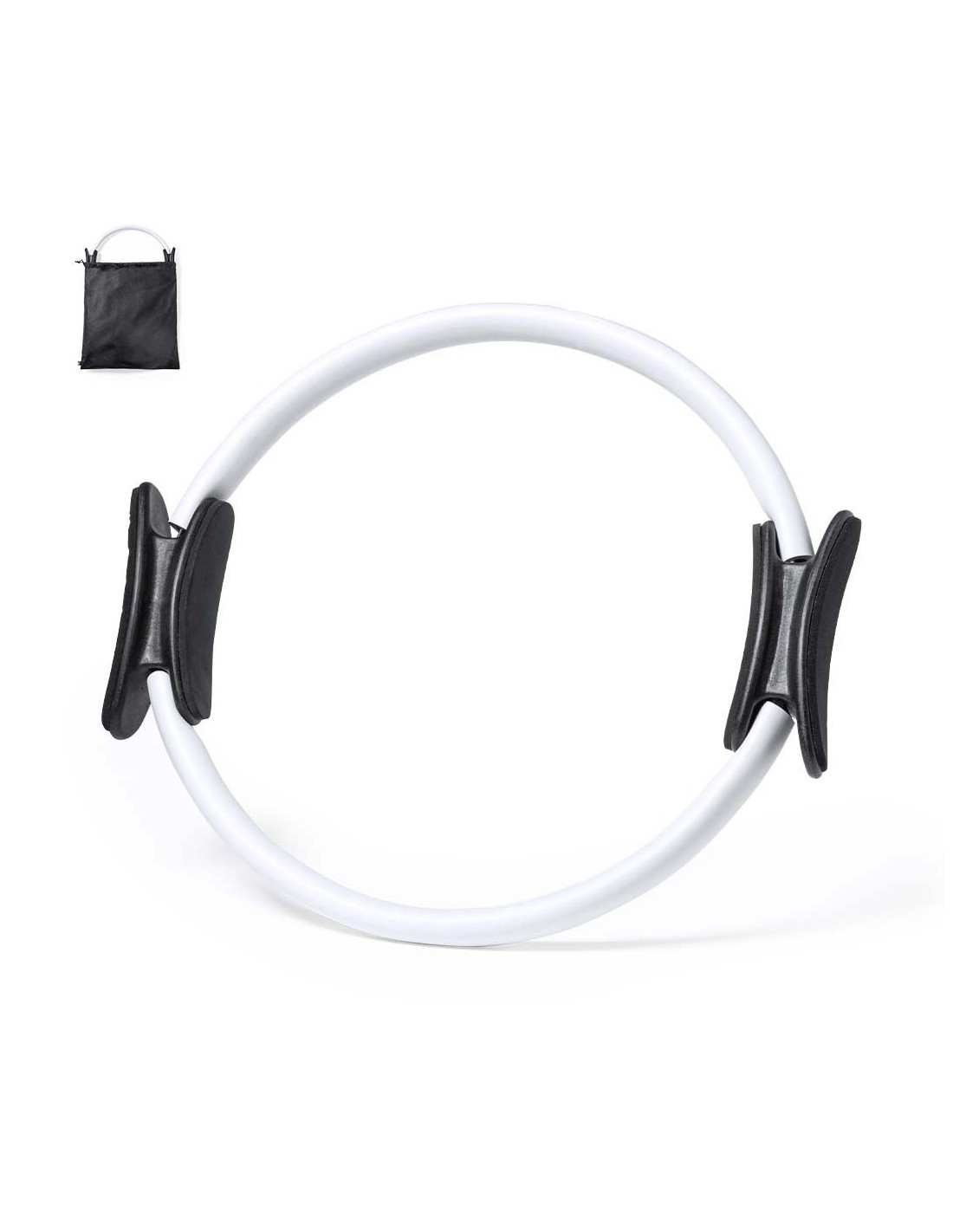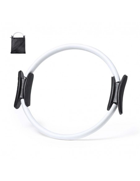 Anello per esercizi in robusta fibra di vetro con rivestimento in EVA. Manici ergonomici in ABS. Comprende un manuale di istruzioni in inglese e spagnolo. Confezionato in un sacchetto personalizzato in TNT RPET, con chiusura a coulisse ed etichetta RPET.