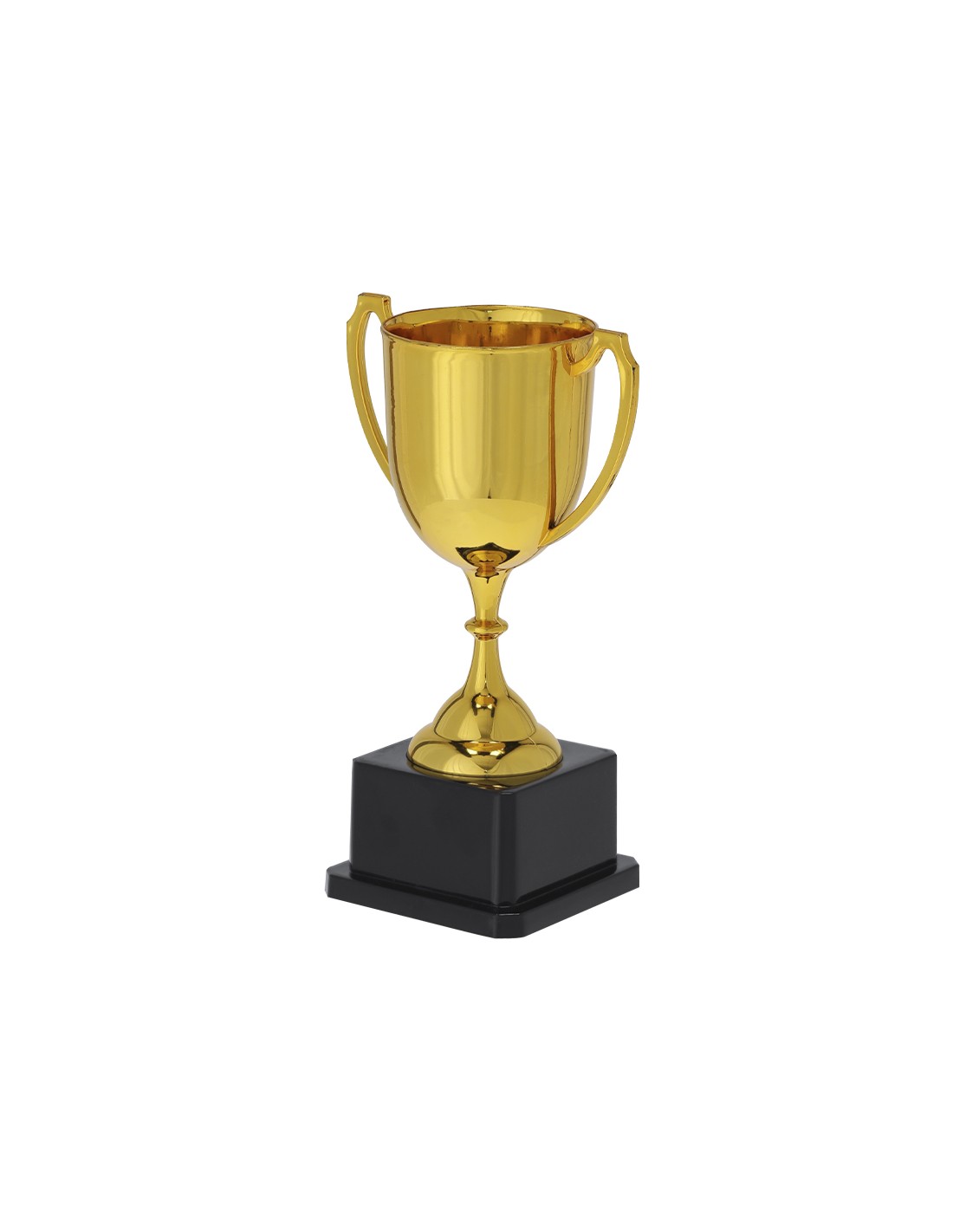 Trofeo personalizzato con una finitura elegante e lucida di colore dorato, con ampie maniglie e una base di colore nero.