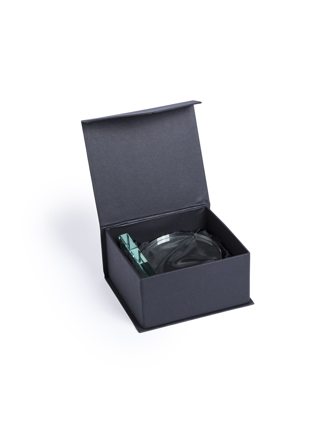 Targa per trofei in vetro spesso con elegante design circolare e base quadrata, personalizzata. Presentata in una custodia protettiva individuale.