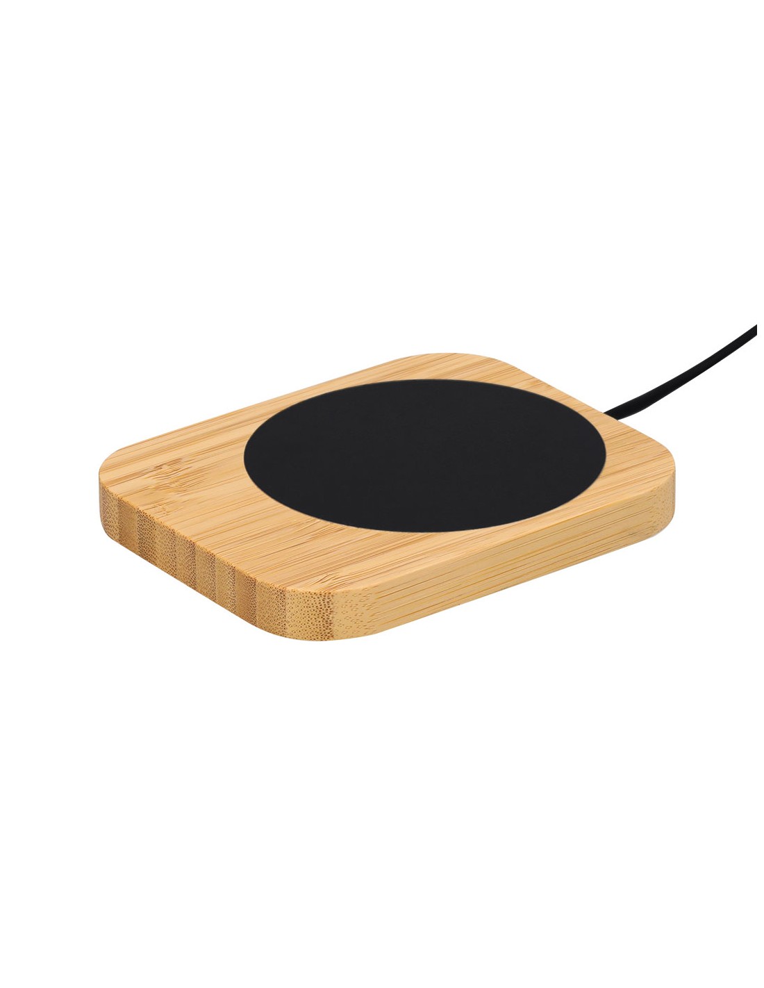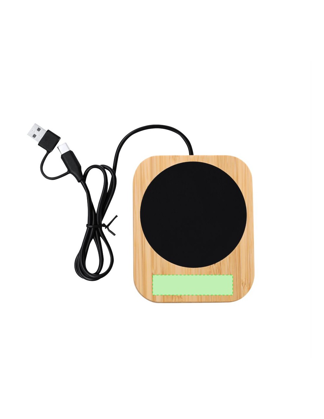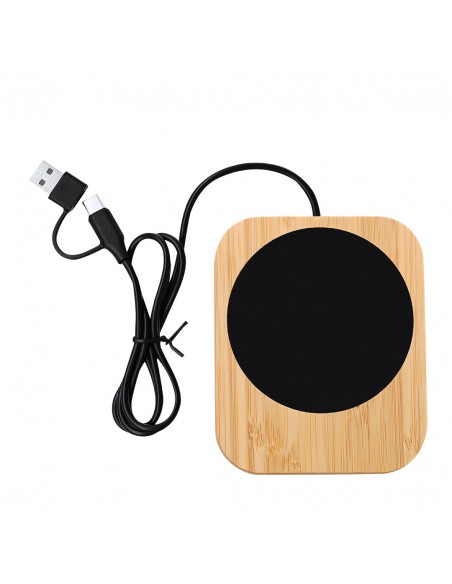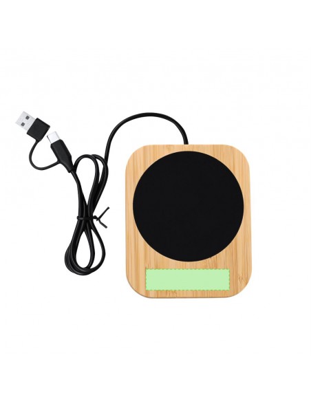 Scaldatazza con corpo in bambù personalizzato. Ideale per mantenere le bevande alla temperatura ideale. Include un cavo di ricarica da 1 metro con doppia connessione di tipo C e USB.