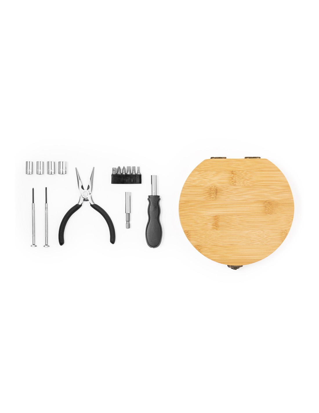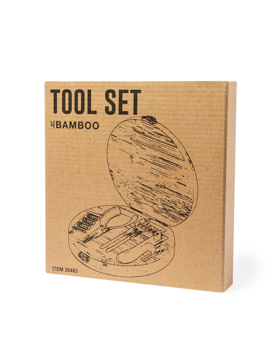 Set di utensili in una robusta scatola di bambù con chiusura in metallo, personalizzata. Con interno in bambù fustellato per una perfetta aderenza degli utensili. Include 15 accessori: chiavi a bussola, pinze con sezione tagliente, cacciaviti di precisione (piatti e a croce) e cacciavite con una moltitudine di punte piatte, a croce, esagonali e torx. Presentato in una scatola kraft di design.