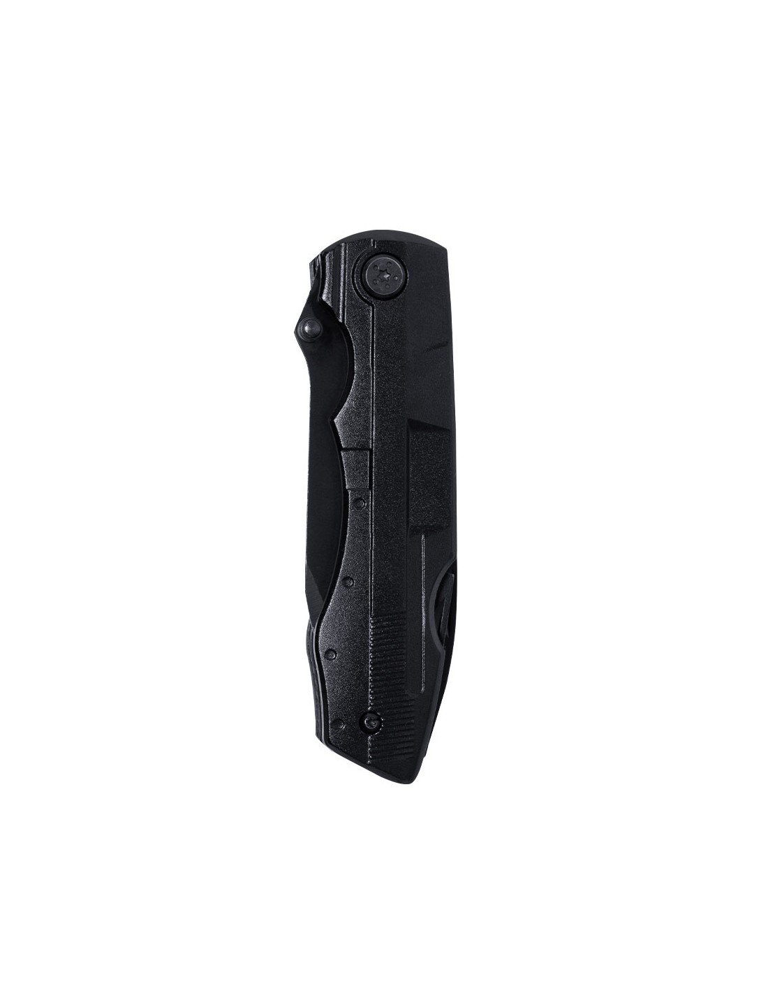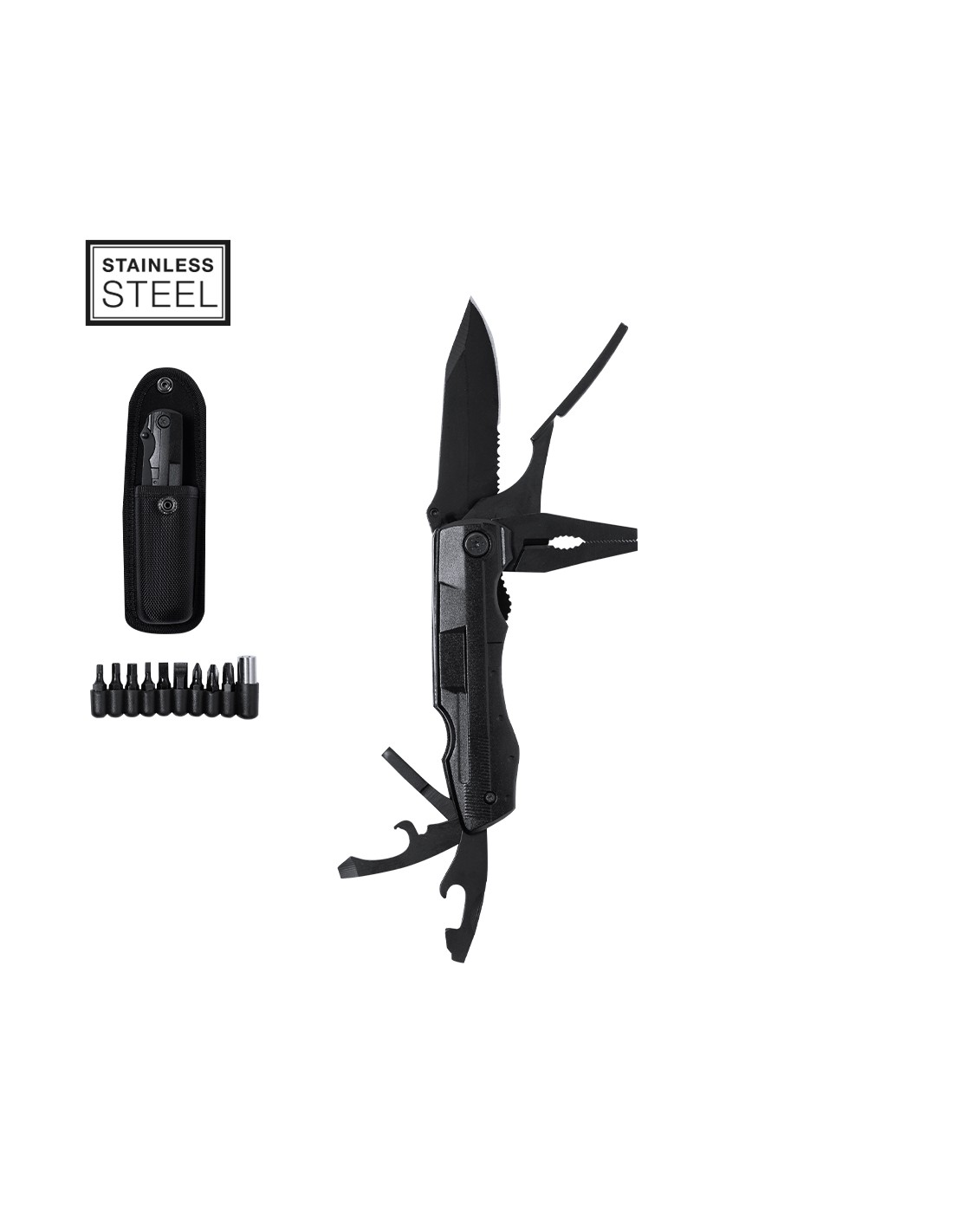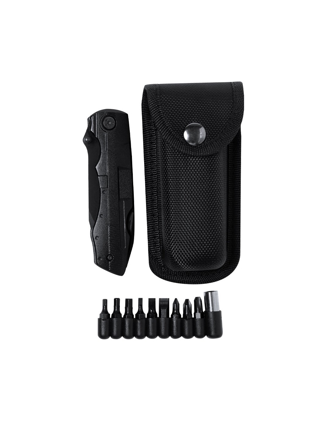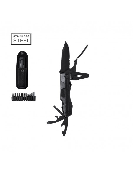 Coltello multiuso con finitura nera in acciaio inox e resistente impugnatura coordinata in alluminio, personalizzato. Design pieghevole e dimensioni compatte. Include 10 funzioni: