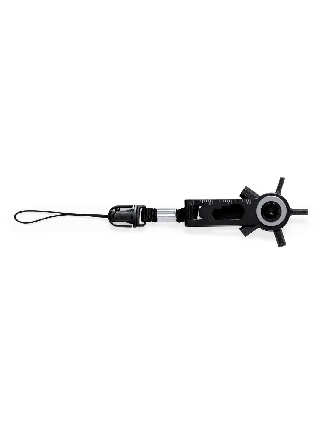 Efficiente multiutensile con impugnatura girevole in acciaio inox con finitura nera, personalizzato. Con 10 funzioni: chiavi a brugola, chiavi esagonali di varie dimensioni, righello e un pratico accessorio per il trasporto con chiusura a fibbia. Presentato in una scatola di carta kraft riciclata.