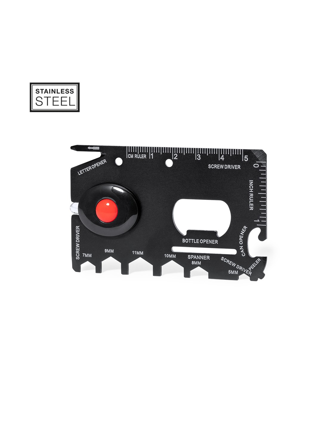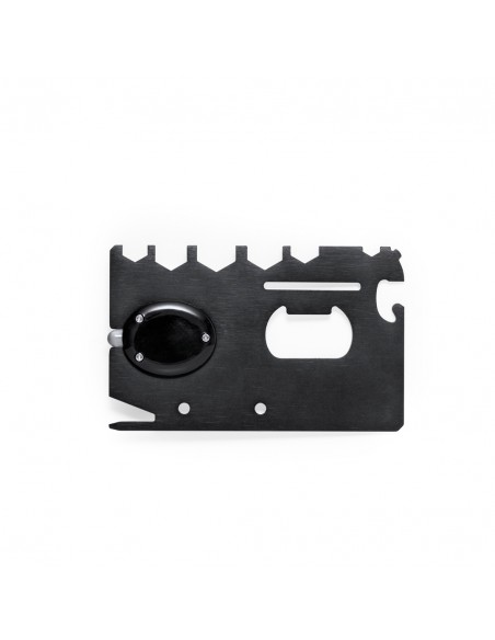 Pratico multiutensile realizzato in acciaio inox e rifinito in nero, personalizzato. Design a forma di carta piatta con 16 funzioni: cacciaviti piatti, tagliacarte, righello in cm e pollici, apribottiglie, apriscatole, pelapatate, chiave per dadi esagonali di varie dimensioni e torcia (batteria a bottone inclusa). Presentato in un sacchetto individuale in carta riciclata.