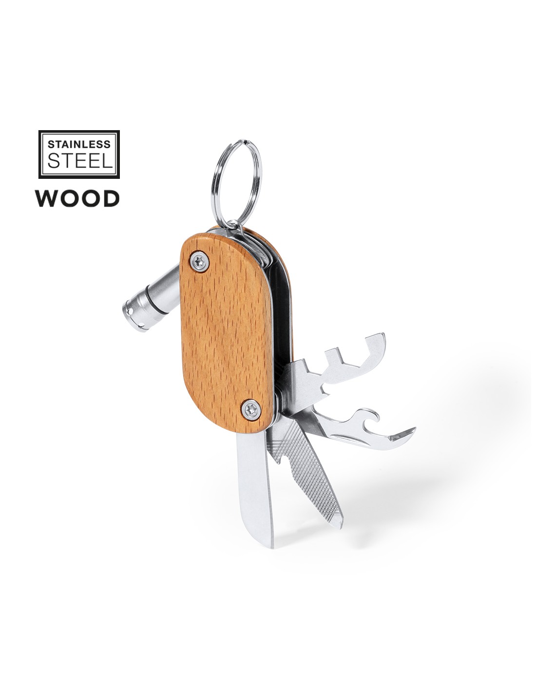 Pratico portachiavi multiutensile in robusto acciaio inossidabile e legno, personalizzato. Con 9 funzioni: cacciavite, apribottiglie, coltello, apriscatole, lima, chiavi varie e torcia a LED singola. Alimentato a batteria (3 batterie a bottone incluse) e presentato in una scatola kraft individuale.