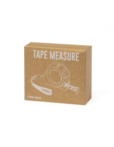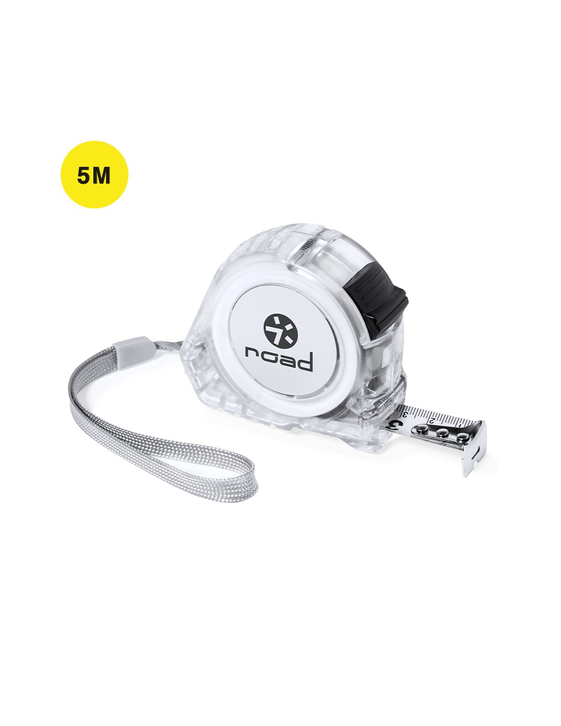 Flessometro da 5 metri con lama in metallo e meccanismo di bloccaggio, personalizzato. Con corpo in originale finitura trasparente, clip da cintura in metallo e cinghia di trasporto. Confezionato singolarmente in una scatola dal design kraft.