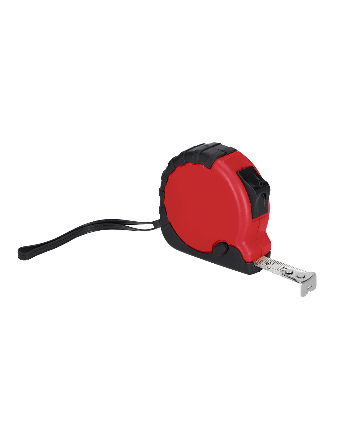 Flessometro realizzato in RABS di 3 metri con lama metallica e meccanismo di blocco, personalizzato. Rivestito con custodia protettiva in resistente gomma, clip metallico per cintura e cinghia di trasporto. Con logo di RABS sul retro.