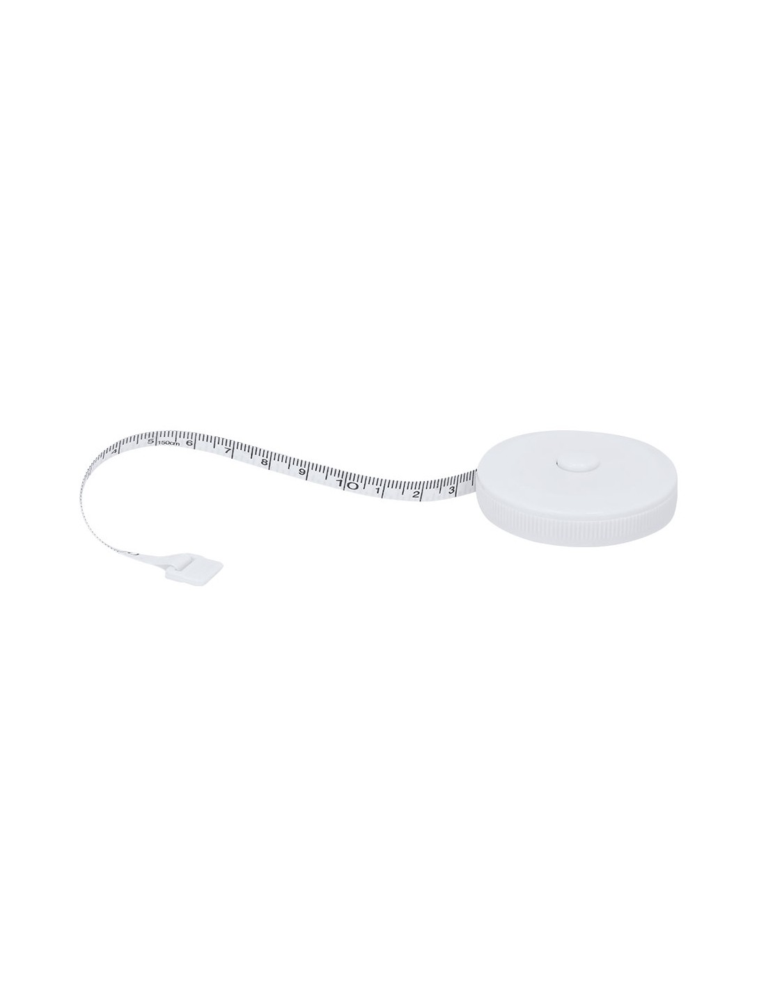 Flessometro in PVC di 150 cm di lunghezza personalizzato, con meccanismo retrattile con pulsante di arresto. Scala stampata in nero cm e pollici.