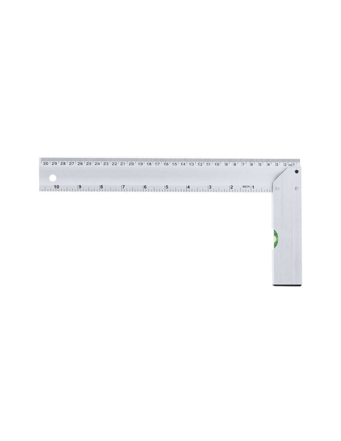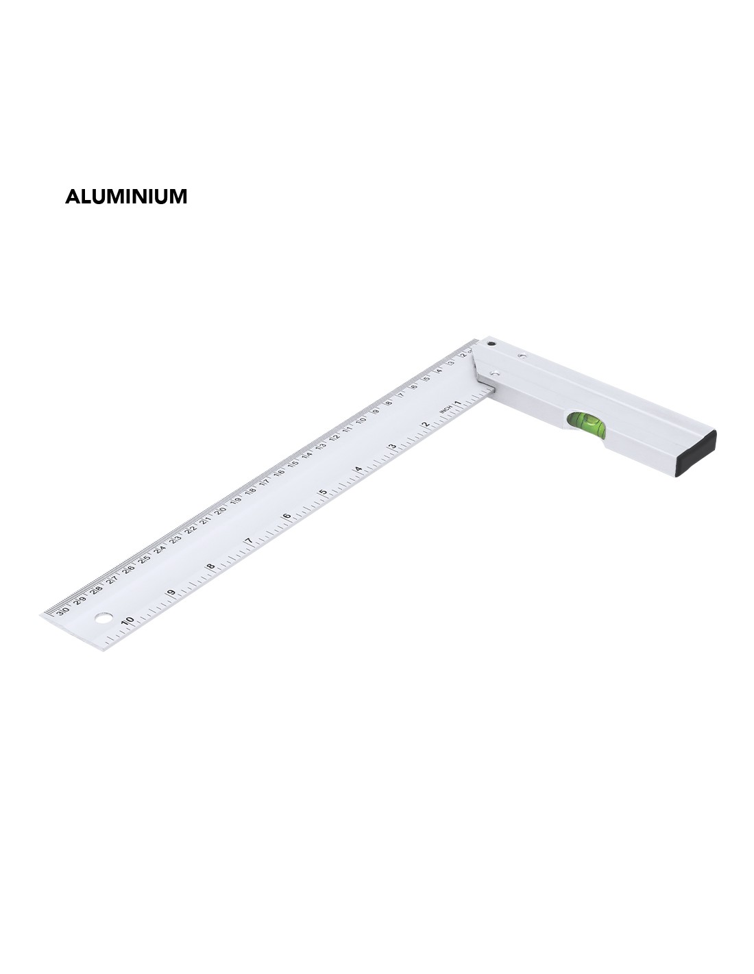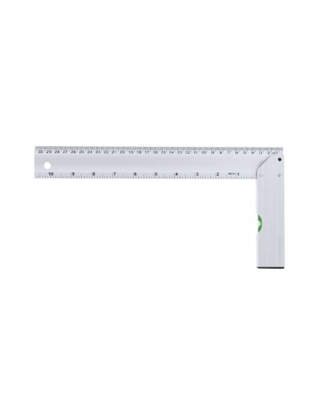Squadra a forma di L, realizzata in alluminio, con lunghezza di 30,5 cm e misure in pollici di 10,5”. Progettata con un'impugnatura che incorpora una livella e un pratico foro per appenderla, facilitando il suo stoccaggio.