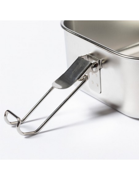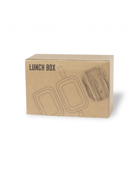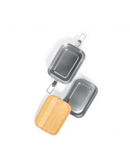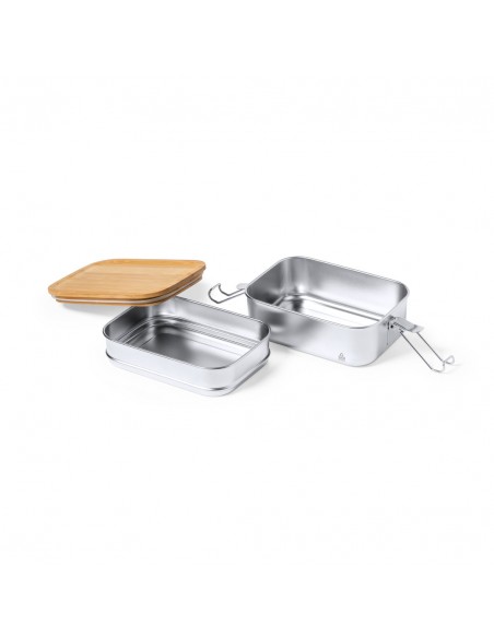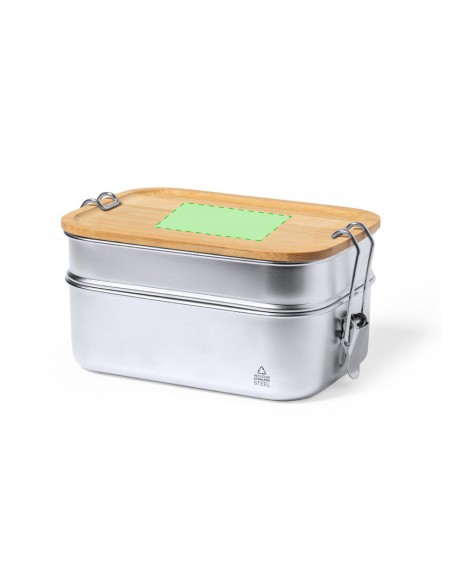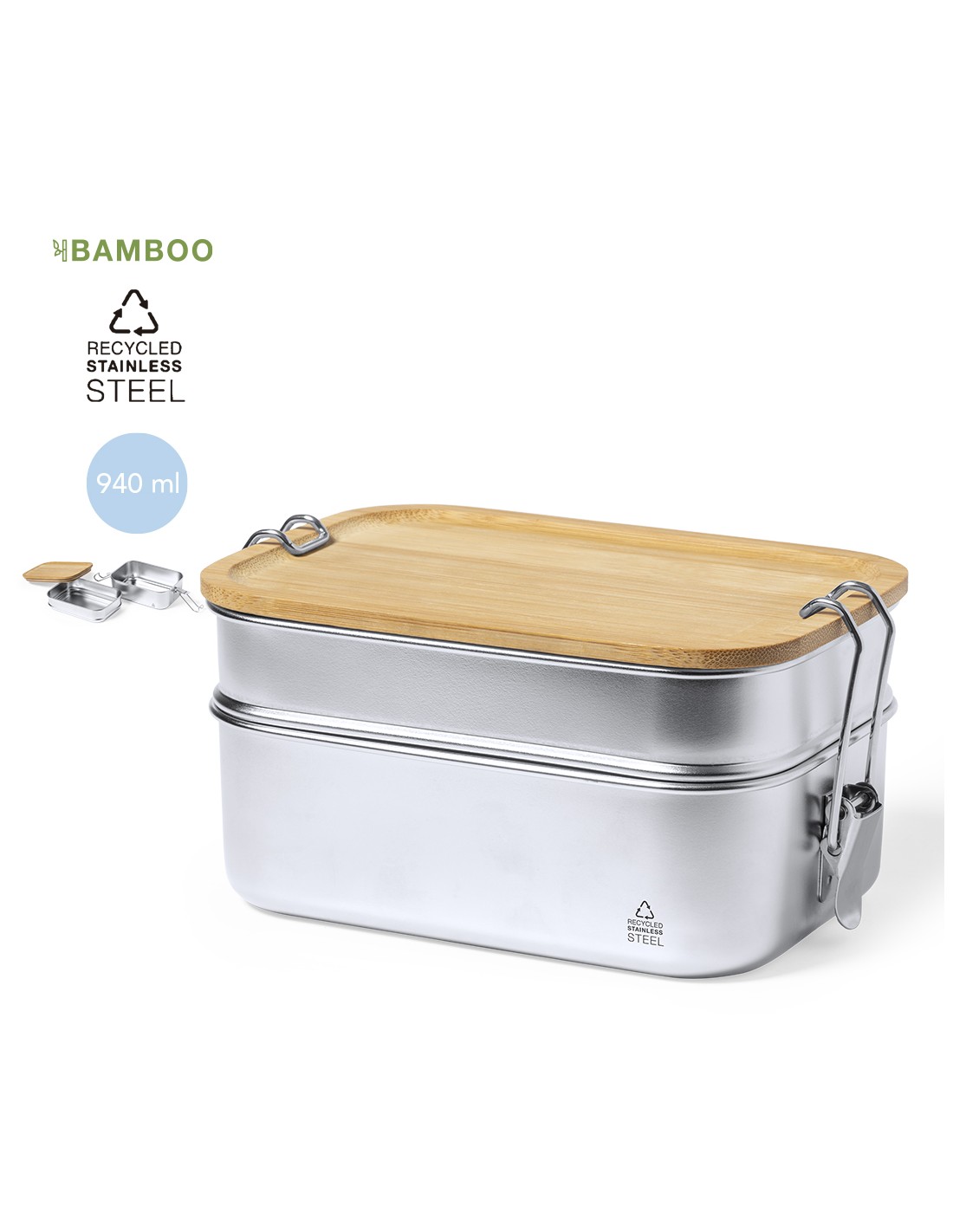 Porta pranzo personalizzato con capacità da 940 ml, realizzato in acciaio inox riciclato. Due scomparti da 340 ml e 600 ml, con coperchio ermetico in bambù e chiusure di sicurezza con etichetta acciaio inox riciclato. Presentato in una scatola individuale.