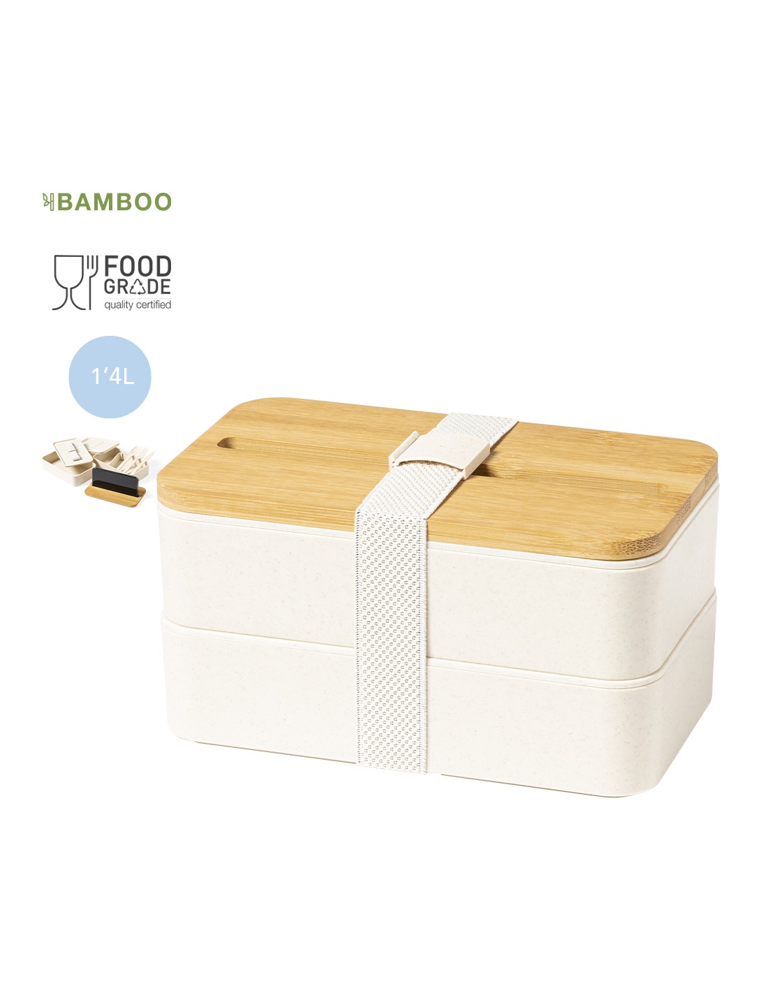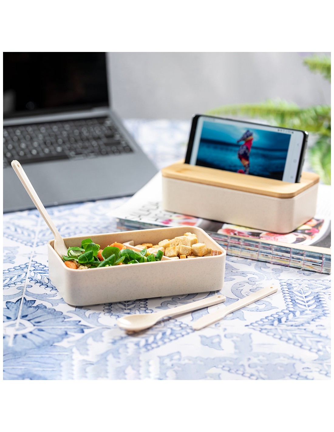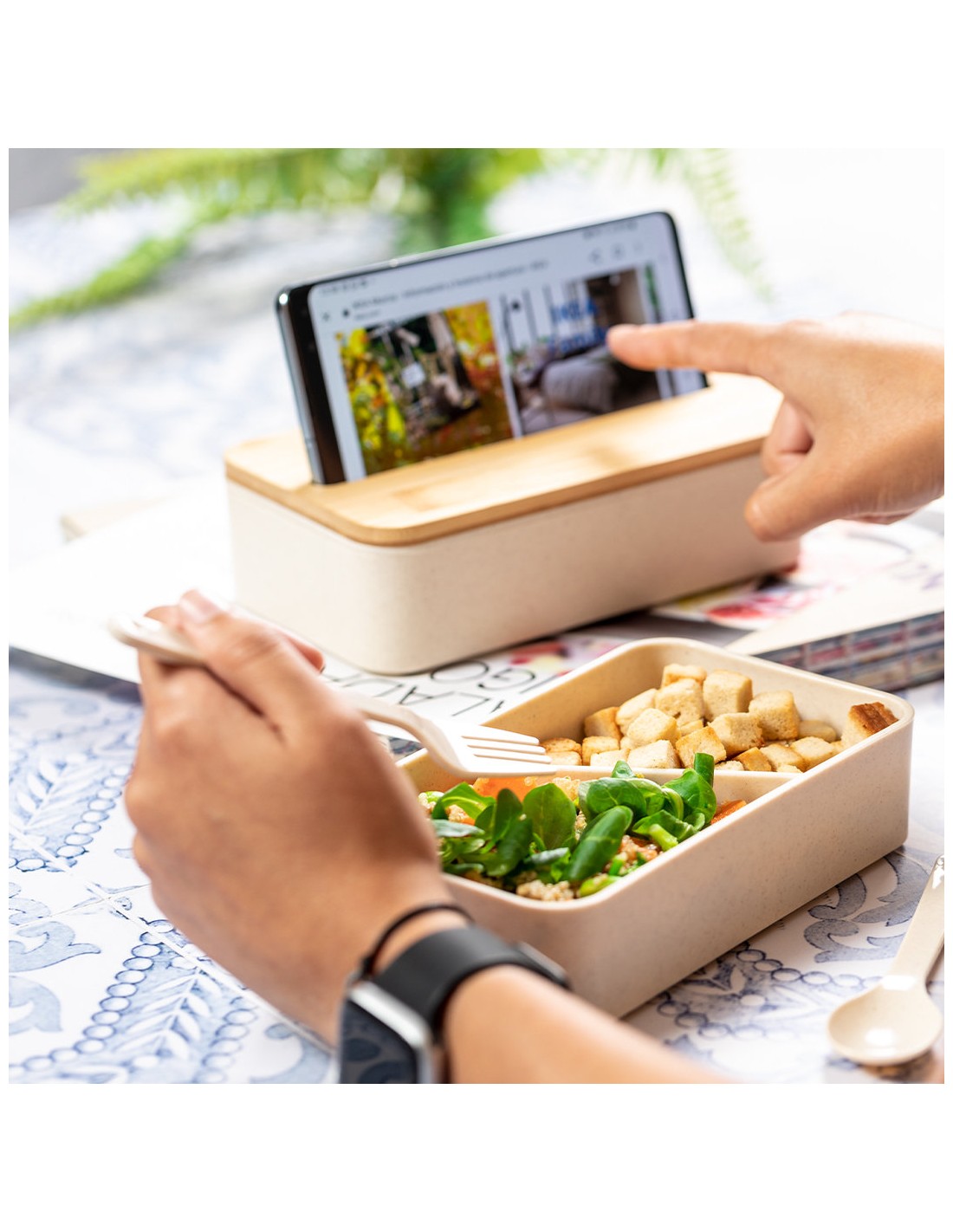 Innovativo set di lunch box personalizzato da 1,4 L in resistente PP venato, privo di BPA. Coperchio in bambù con porta smartphone integrato.
