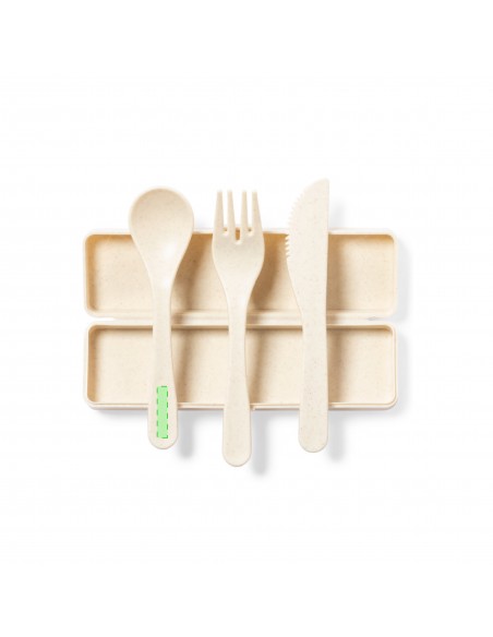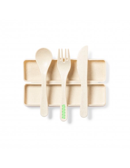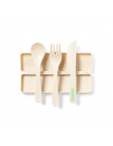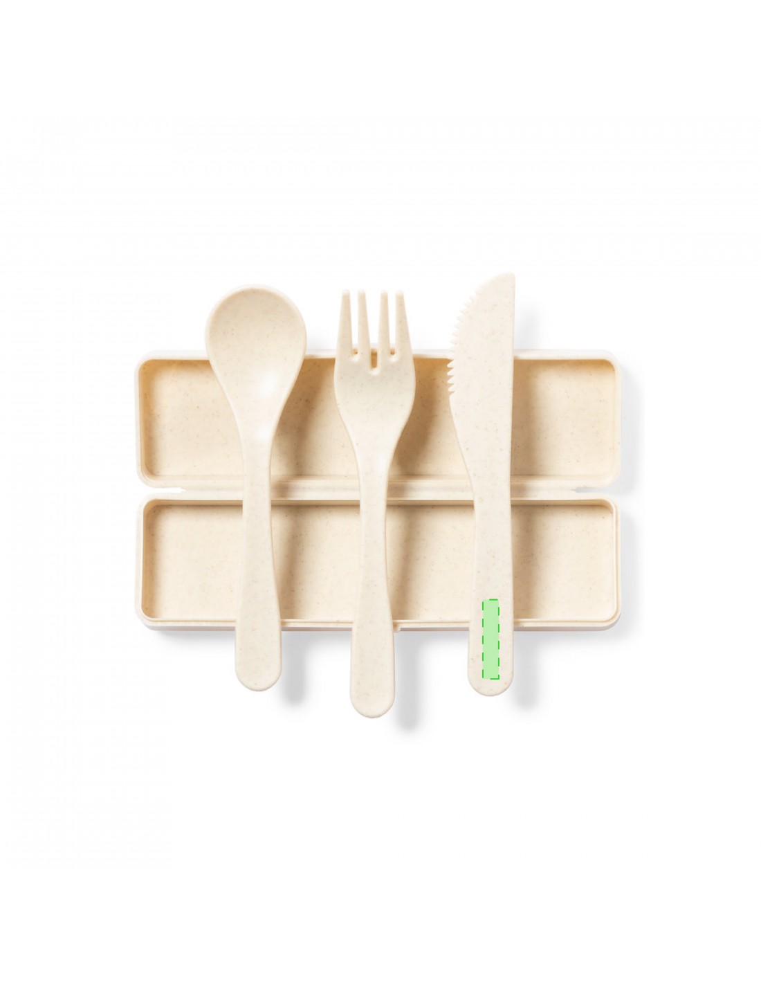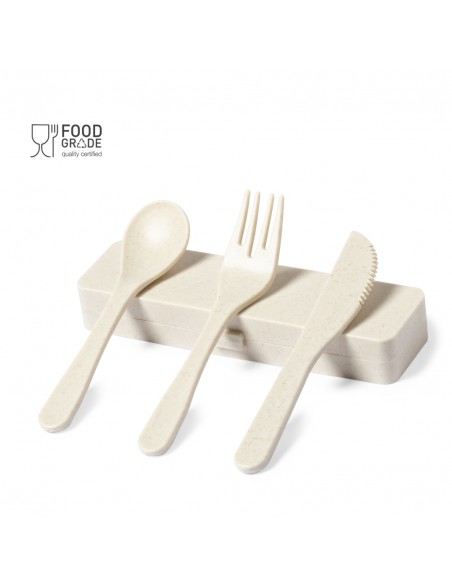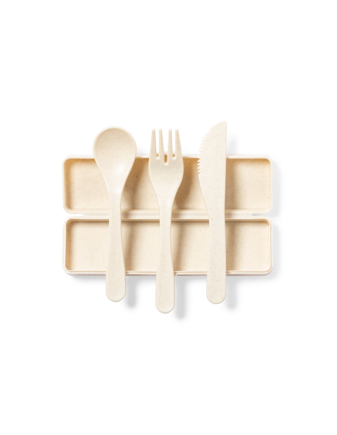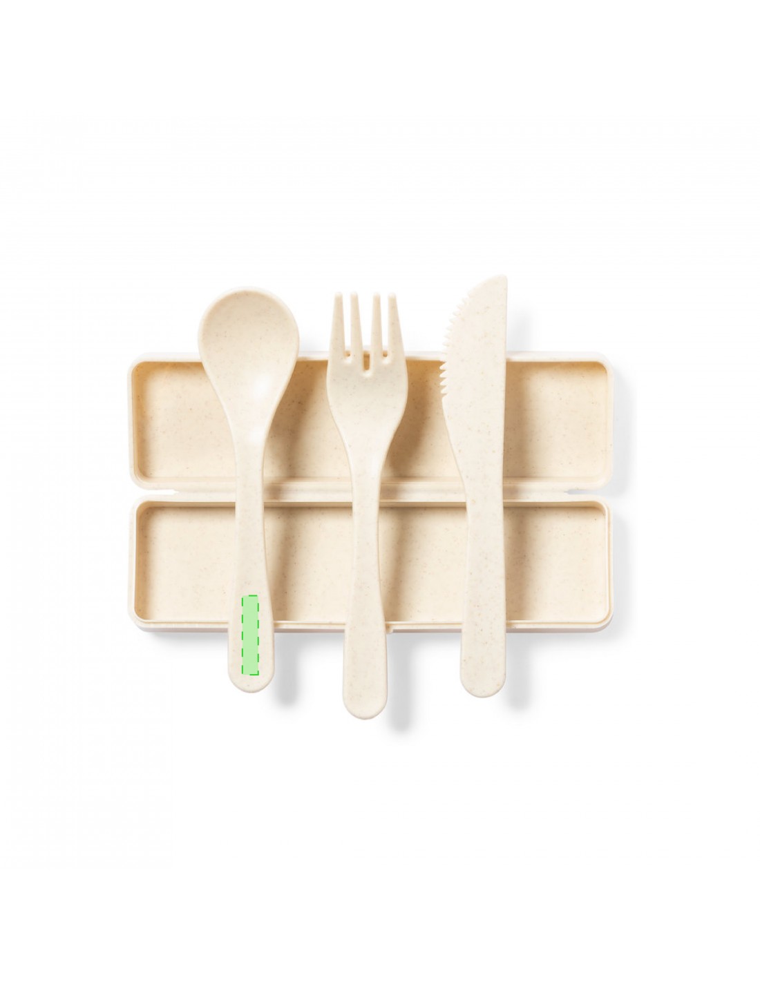 Set di posate personalizzato in PP con finitura venata, senza BPA, con scatola abbinata. Include cucchiaio, forchetta e coltello.